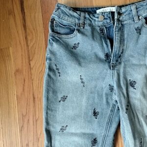 Chic ankle jeans with black embroidered accents. Light blue wash. Perfect for casual outings. Gently used - in great condition without major flaws.