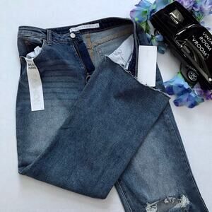 NWT. High Rise Flare Jeans for Juniors Size 9. Zipper and button for closure, 5 pockets design, has loops, medium wash, ankle length, distressed, raw hem leg openings, "whiskering" effect front. Pictures are part of description.