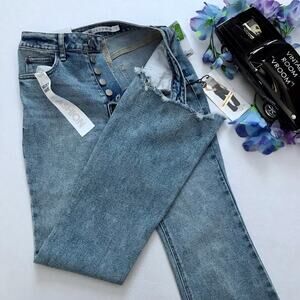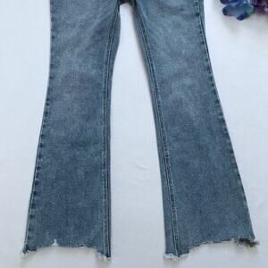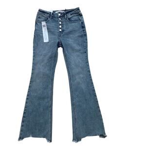 NWT. High Rise Flare Jeans for Juniors/Women Various Sizes. 5 buttons for closure, 5 pockets design, has loops, light wash, raw hem asymmetrical leg openings, subtle "whiskering" effect front. Pictures are part of description.