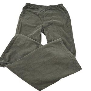 Soft and comfortable olive green corduroy pants with elastic waist and back pockets. Suitable for casual wear or lounging.