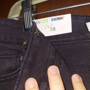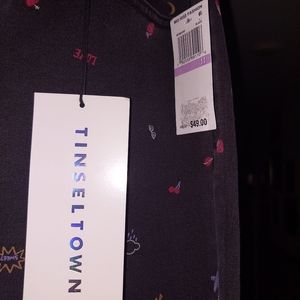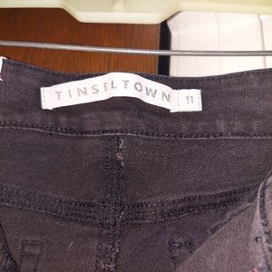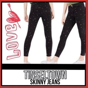 Denim with a pop snappy, colorful graphics up the cool factor of these black Tinseltown skinnies 5 functional pockets Button and zipper closure Mid-rise NWT Measurements pictured