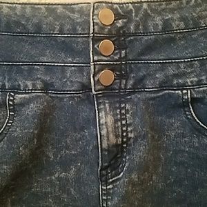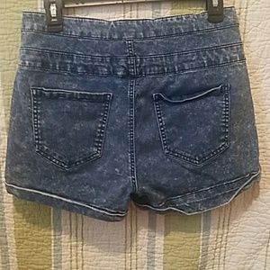 Blue acid wash, high waisted denim shorts.70% cotton, 28% Polyester, and 2% spandex. The shorts are to be washed on cold and without bleach. The shorts are to be dried on tumble dry low.