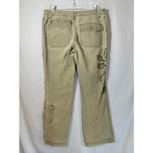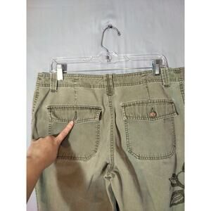 Tint Green Jeans. Straight/wide leg. Embroidered Floral design on one leg, small pocket on the other. Missing one back pocket button, front button area has been mended. Size 12. 32" waist, 30" inseam.