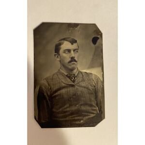 Antique Tintype Photograph Long Faced Man with Mustache, Plaid Jacket and Striped Shirt