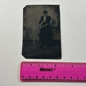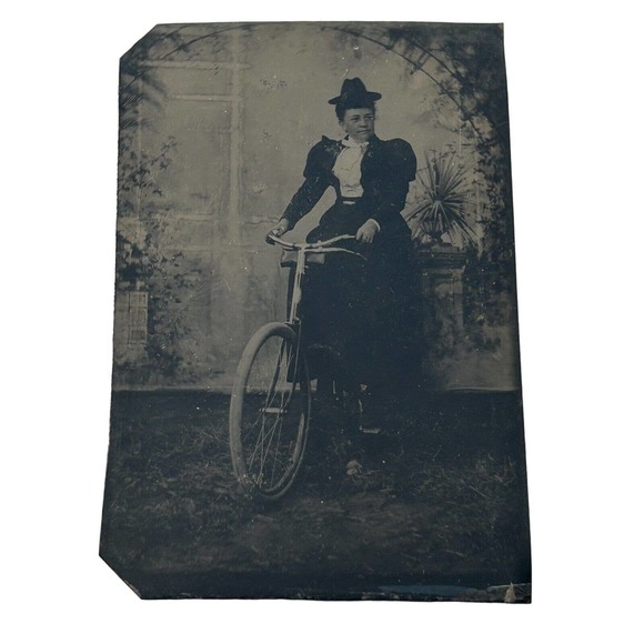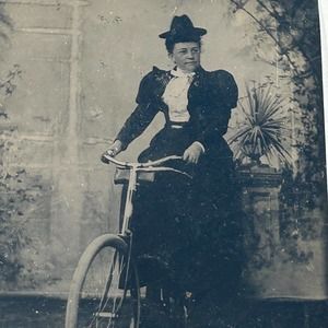 Tintype Woman on Bicycle Victorian Fancy Dressed Woman in Hat Found Photo