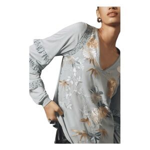 Tiny for Anthropologie Frances Light Blue Floral Embroidered Blouse. Featuring Ruffled Long Sleeves, a V-Neck Neckline with Ric Rack detailing and a Pull-Over style. It is great for casual days at work, school, date night, night out with the girls, and Family Dinner. It would make a great Christmas Hanukkah Valentine’s Day Birthday or any Holiday gift!