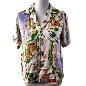 Good condition, minor signs of wear, couple small snags, no rips, holes or tears, cute allover Swiss Alps novelty print, button front, single pockets, short sleeves, viscose/rayon blend