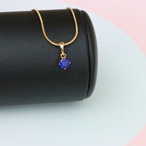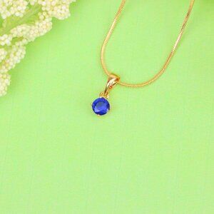 Refined and petite pendant featuring a deep blue round-cut stone. Made with gold-plated high quality brass, perfect for subtle everyday sophistication.