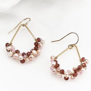 Stunning pearls, garnets, and pink zircon teardrop hoop earrings composed of AAA high luster tiny freshwater pearls accented with faceted red garnets and gorgeous earth mined pink zircon rondelles.