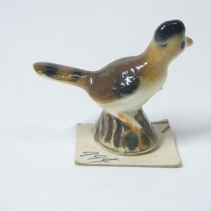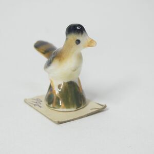 Vintage porcelain bird figurine. Very tiny, about 1 inch tall. Possibly bone china. Glued to a small square of cardboard, so I cannot tell if there is a signature on the bottom. Nice shape, no chips or cracks.