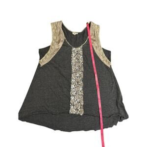 ✨ Add sparkle to your wardrobe with this unique tank top by Tiny! Features a soft charcoal gray knit front with a dazzling vertical sequin panel, champagne satin shoulders, and delicate beige lace racerback detailing. Flowy fit, flattering cut—perfect for layering or wearing solo for a chic boho glam vibe. Pair with jeans, skirts, or shorts for an effortlessly cool look. 💫
