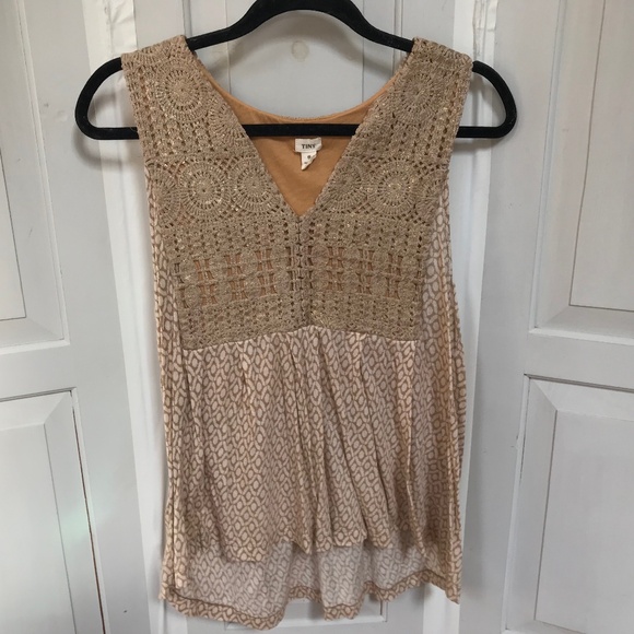 Tiny super cute tan sleeveless boho top with intricate lace detailing with areas of gold paint to give it a unique metallic look.. Back is longer than the front and bodice is lined. Perfect for a chic look.