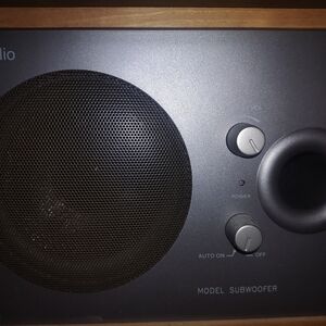 Experience high-quality sound with aux speaker with powered subwoofer Featuring a real wood design, this system is perfect for any audio enthusiast. Enjoy your favorite tunes with style and clarity. Great sounding system there's a remote included with all cables