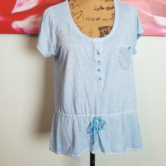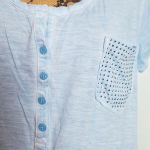 Light blue denim with sequined pocket on left. Short sleeve. Great with jeans! 55% cotton 45% viscose.