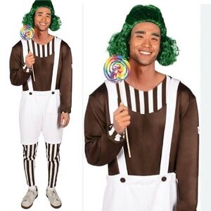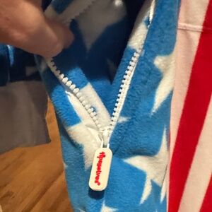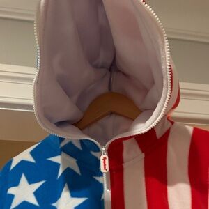 Patriotic onesie with stars and stripes design. Features a hood and full-length zipper.