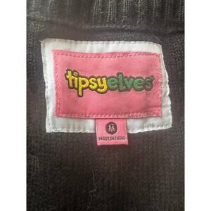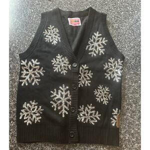 Black sweater vest with button front. Sequin snowflakes all over it. Tipsy Elves branding on the side.