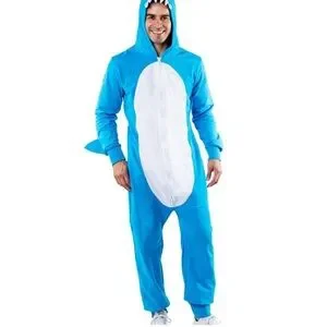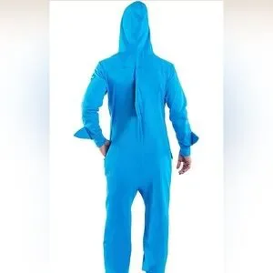 Fun shark costume with a playful design. Features a blue body and white belly. Perfect for Halloween or dress-up.