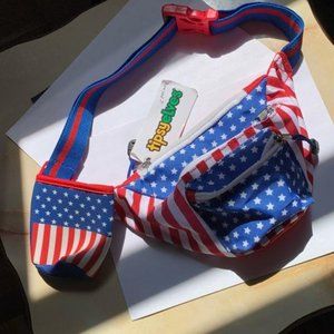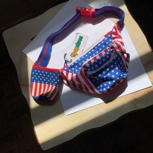 Nothing says "sensible all-American style"better than the trusted and faithfully worn fanny pack. You can store your valuables safely under the protection of the world's greatest superpower when you use this stunning combination accessory! A blue field with white stars vies with red and white stripes for an American flag look. The main pouch unzips to reveal a roomy storage space; a small zippered pocket in front allows for easy access to keys or cash; and a detachable drink holder strategically placed at one hip letsWATER, AIR DRY