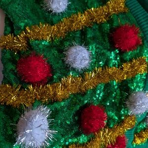 This vibrant green cardigan from Tipsy Elves features an eye-catching design with multicolored pom-poms and shiny tinsel-like strands that create a festive atmosphere. The elaborate decorative elements form a V-shaped pattern reminiscent of a Christmas tree, making it a perfect choice for holiday celebrations.