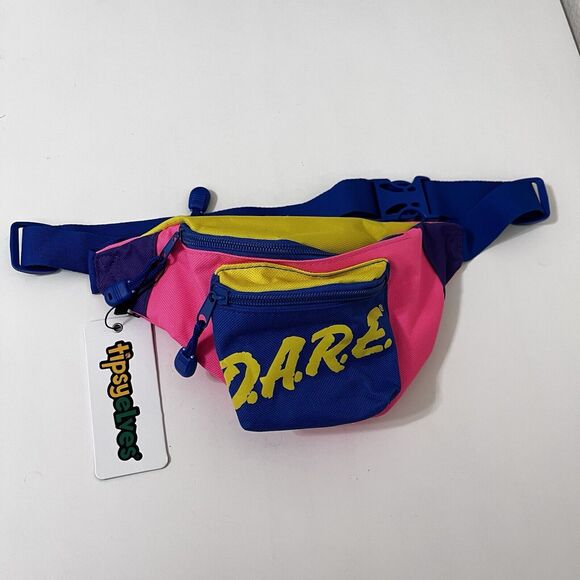 Tipsy Elves Neon Retro DARE Fanny Pack. New With Tags - never worn, but there are dents/pulls on the top of the pack - please see the pictures. Nothing major. Neon yellow, pink, purple and blue with D.A.R.E. written across the front in yellow. Three separate zipper pockets. Works for both men and women in my opinion. The inside tag says 100% Cotton.