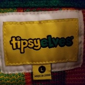 HP 12/9/2024 Tipsy Elves Pasta Chips Ugly Christmas Sweater Large. Santa, Snowman, Reindeer and an Elf all are on this crazy sweater with red and green faire isle sleeves. Measures 21 inches across the chest, 29 inches long and sleeves are 28 inches. Condition is excellent pre-owned. perf Perfect for a holiday ugly sweater party or other festivities!