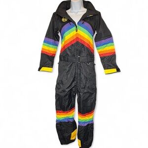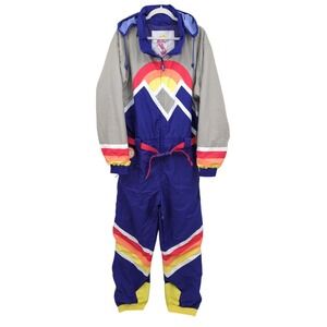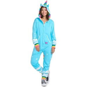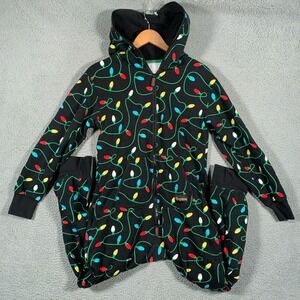 Festive Santa onesie with hood. Features black belt design. Perfect for holiday fun.