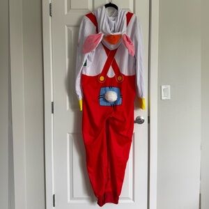 Fun bunny costume with red overalls and white hoodie. Features colorful bow tie and bunny ears.