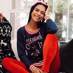 Fun blue sweater with festive reindeer and 'Sleighin It' design. Red and white striped accents add charm.
