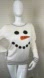 Cozy sweater with a snowman design. Features black and orange sequin accents on a white base.