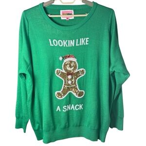 Bring the holiday cheer with this festive Tipsy Elves Christmas sweater! Brand new with tags, it features a sparkling gold sequin gingerbread man in a Santa hat and the cheeky phrase “Lookin’ Like a Snack.” The cozy knit and fun design make it perfect for parties, family gatherings, or ugly sweater contests.