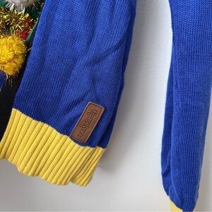 Suspenders always look jolly. Sweaters are super comfy. What if someone figured out how to combine the two? You are in luck - this men's holiday sweater does just that, with wide black suspenders woven directly into the blue design. Jingle bells on each strap add a whimsical touch, and a huge Christmas tree on the front leaves no doubt as to what season you're celebrating!