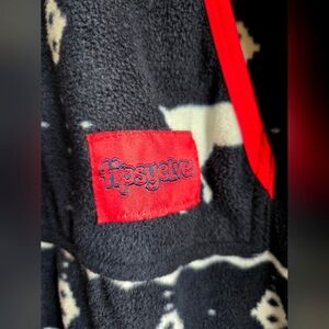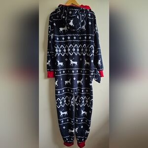 comfortable regardless of where you are or what you are doing during the holiday! The bold blue background features a white Fair Isle design complete with grazing reindeer for good measure. The front pockets include a zipper for security purposes and the Christmas jumpsuit features a holiday red accent color.