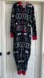 Blue reindeer jumpsuit with red zipper. Features white reindeer and geometric patterns. Ideal for cozy nights