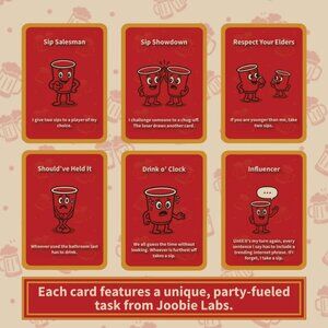 How to Play: STACK. PARTY. DON’T CRASH. Each turn, players draw a card from the deck, read it aloud, and complete the challenge. Then, carefully place the card onto the central cup - balancing it with at least the two card edges touching another card or the cups rim. If you knock the tower down, you finish whatever’s in the central cup. If three or fewer cards fall, you’ll still have to take 3 sips of your own cup. The round keeps going until the tower collapses! The player with the fewest tower collapses wins - bragging rights included.