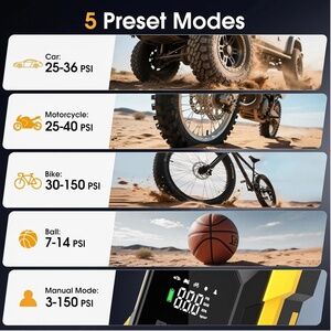 * Smart Preset & Auto-Stop Precision: Set it and forget it! Easily choose from 5 preset modes for different applications. The tire pump for car portable features an intelligent auto-stop function that halts inflation precisely at your target pressure, monitored by the clear digital pressure gauge. No more guessing or over-inflation – just accurate, hassle-free pumping