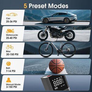 【Smart Preset & Auto-Stop】Set it and forget it! Featuring 5 preset modes (Car/Bike/Motorcycle/Ball/Custom) and real-time Liquid Crystal Display, this tire air compressor portable auto-shuts off at your target pressure. No overinflation—just attach, select PSI/KPA/BAR, and let the intelligent chip do the work. Ideal for adults seeking hassle-free safety