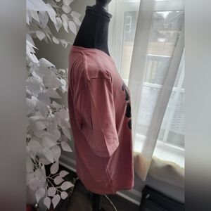 Casual short sleeve crew neck pink t-shirt with 'Tired Moms Club' graphic.