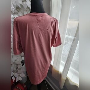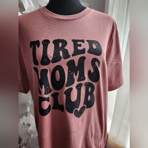 Casual short sleeve crew neck pink t-shirt with 'Tired Moms Club' graphic.