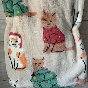 Christmas cat plush throw blanket by 'Tis The Season. This blanket is a light beige color. It has a variety of cats wearing different festive Christmas holiday outfits. One has a Christmas tree cape, one is decorated in present bows, one is in a red Christmas sweater, one is donning a Santa hat, and one has a big red ribbon bow around the neck. It is NEW, with tags. It is attached to the hanger so hanger is included.