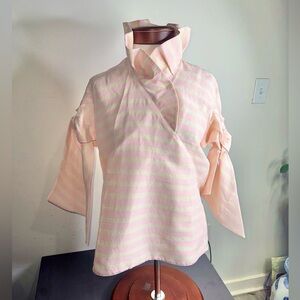 Tish Cox - Pink & Cream Striped Collared Blouse W/ Tied Sleeves