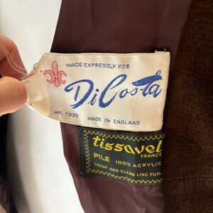 Embrace timeless elegance with this vintage Tissavel faux fur suede jacket. Second photo is true to color. This unique piece showcases a bohemian flair with its luxurious faux fur and cozy suede texture. It’s fully lined for added comfort and warmth, perfect for chilly days. In good vintage condition, though it’s missing one button and has a small marking on the front (see photo). Still a stunning addition to any wardrobe!