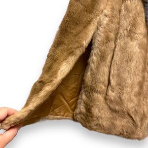 This adorable vintage capelet is in excellent condition. The only flaw is a small tear in the lining, but that is easily repairable. The faux fur is still soft. The capelet has slits for the arms as well. There’s no size, but I’d say one size fits most. It’s hard to measure, but it is open in the front and should easily fit just about anyone.