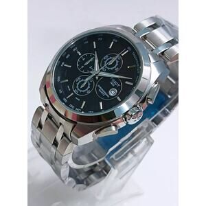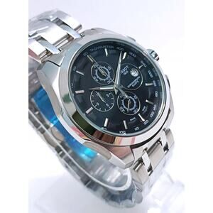 This watch has a stainless steel case in great condition with almost no flaws. The face features Silver accents on a Black Face giving an awesome vintage look overall. It also has a date function! This watch is brand new however does not come with original box and papers.