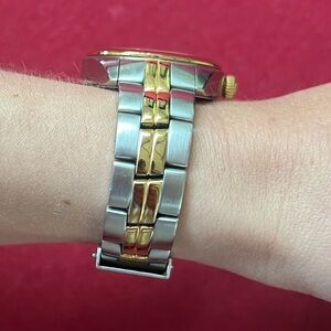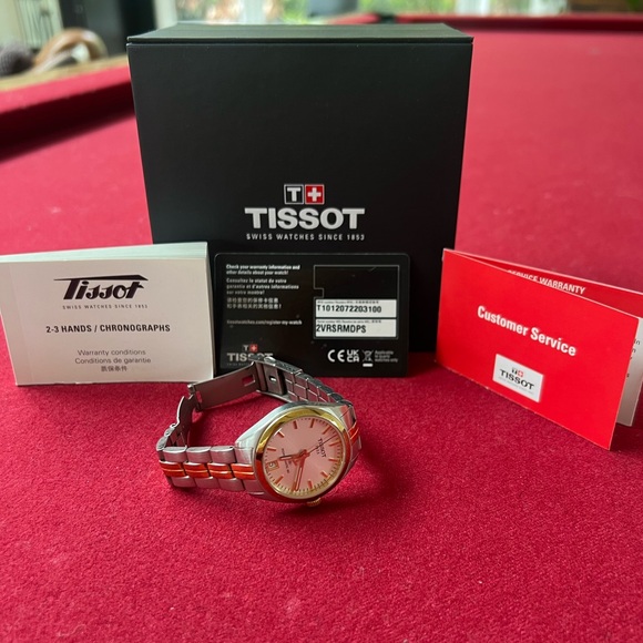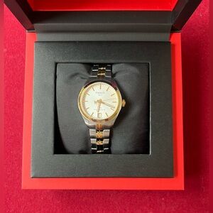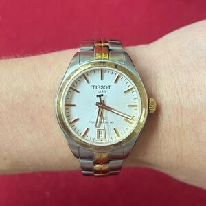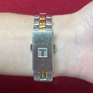 Stylish Tissot watch with a two-tone design. Features silver and gold accents. Ideal for versatile wear!
