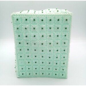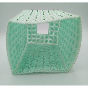 Enhance your home decor with this handmade tissue box cover. Crafted with vintage green plastic canvas, it fits over a 5.5 - 5.75-inch tissue box, adding a retro touch to any space. Perfect for bathrooms, bedrooms, or living rooms.