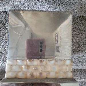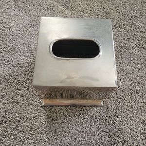 Silver tissue box with shells border. Fits over a small square box of tissues. Gently used.