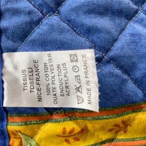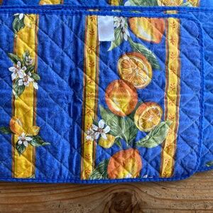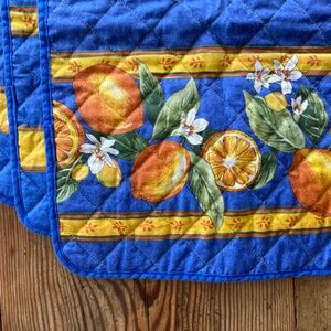 Set of four quilted cotton placemats. Made in France. Gently used in very good condition. 100% cotton with poly coating. 16 3/4 x 11 1/2 inches. Lemons and flower design.