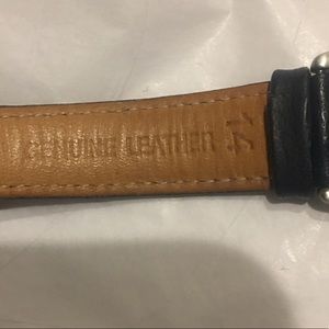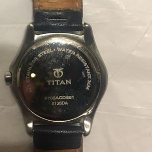 Titan women’s round faced (1”) stainless steel watch with dark navy genuine leather straps. Water resistant 30m. Extends from 6 1/4” to 8” around wrist. Needs new battery