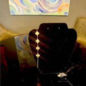 Add a touch of elegance to your outfit with this stunning Clover sparklingGold Colored Bracelet. The bracelet features a beautiful round gold-colored stone that adds a warm and inviting glow to your wrist. The stone is set in a unique clover-shaped design that adds a touch of artistry to your jewelry collection. This bracelet is perfect for any fashion-conscious woman who loves to accessorize. It is an original piece of jewelry that is not antique or vintage. The bracelet is made of high-quality materials that are not only durable but also hypoallergenic. This bracelet is a must-have for any woman who loves to make a statement with her jewelry.