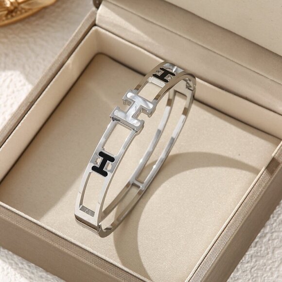 Titanium Steel Luxury Fashion Bangle, H , Pearl White and Black. Hinge Opening.